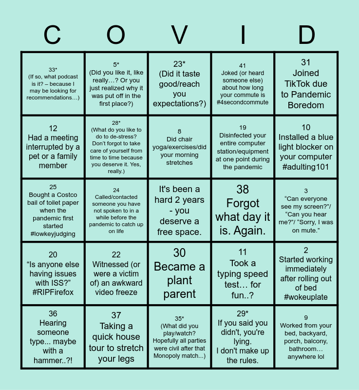 This bingo card has a free space and 42 words: 1 Wore pyjamas to a video meeting, 8 Did chair yoga/exercises/did your morning stretches, 15* (What are you learning/practicing? What made you decide to pick it up?), 22 Witnessed (or were a victim of) an awkward video freeze, 29* If you said you didn't, you're lying. I don't make up the rules., 2 Started working immediately after rolling out of bed #wokeuplate, 9 Worked from your bed, backyard, porch, balcony, bathroom… anywhere lol, 16 Wore the same outfit 2+ days in a row #judgementfreezone, 23* (Did it taste good/reach you expectations?), 30 Became a plant parent, 3 “Can everyone see my screen?”/ “Can you hear me?”/ “Sorry, I was on mute.”, 10 Installed a blue light blocker on your computer #adulting101, 24 Called/contacted someone you have not spoken to in a while before the pandemic to catch up on life, 31 Joined TikTok due to Pandemic Boredom, 4 Accidentally left the “raise hand” emoji on MS Teams, 11 Took a typing speed test… for fun..?, 17 Binged at least 3 Netflix series, or on other streaming services, 25 Bought a Costco bail of toilet paper when the pandemic first started #lowkeyjudging, 32* (How did it go? Please tell me it went okay…), 5* (Did you like it, like really…? Or you just realized why it was put off in the first place?), 12 Had a meeting interrupted by a pet or a family member, 18* (How guesses did it take you to guess correctly? Did you cheat? Be honest...), 26* (What show was it? Please don't say "The Office"...), 33* (If so, what podcast is it? – because I may be looking for recommendations…), 6 Spotted a pet in the background of a video meeting, 13 Created a makeshift “standing desk”, 19 Disinfected your entire computer station/equipment at one point during the pandemic, 27 Any variation of “In these unprecedented times…”, 34 Made a list of household chores/things to do with your new found time – just to ignore it all #Itbelikethatsometimes, 7 Took a coffee/tea break this morning… or three, 14* (What is the most recent/favourite song that you listened to?), 20 “Is anyone else having issues with ISS?” #RIPFirefox, 28* (What do you like to do to de-stress? Don’t forgot to take care of yourself from time to time because you deserve it. Yes, really.), 35* (What did you play/watch? Hopefully all parties were civil after that Monopoly match...), 21* (What was it? Was the money spent on it worth it?), 36 Hearing someone type... maybe with a hammer..?!, 37 Taking a quick house tour to stretch your legs, 38 Forgot what day it is. Again., 39 Made an unnecessary purchase on Amazon #retailtherapy, 40 Got interrupted by an Amazon Delivery #multitasking, 41 Joked (or heard someone else) about how long your commute is #4secondcommute and 42 "Is it the VPN having issues or is it my Wi-Fi connection..?".