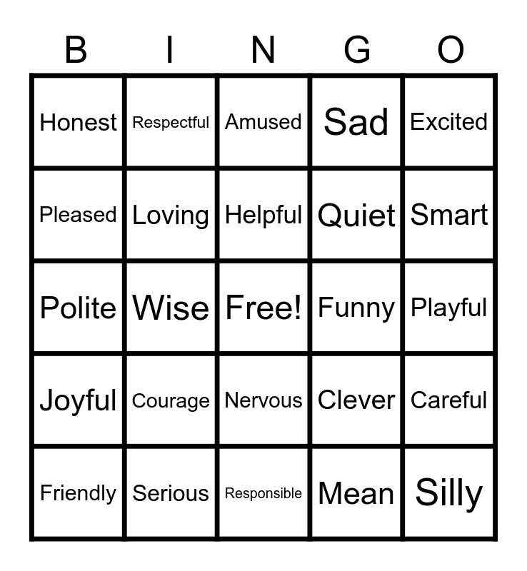 This bingo card has a free space and 25 words: Courage, Responsible, Helpful, Friendly, Excited, Honest, Pleased, Respectful, Funny, Nervous, Quiet, Polite, Clever, Careful, Loving, Reliable, Playful, Amused, Smart, Wise, Silly, Serious, Joyful, Sad and Mean.
