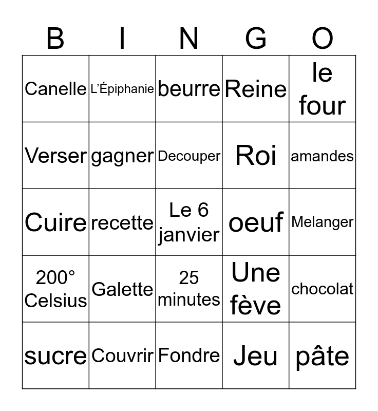 This bingo card has a free space and 24 words: Galette, Couvrir, Decouper, sucre, le four, Canelle, Verser, L’Épiphanie, oeuf, 25 minutes, Roi, Cuire, Une fève, chocolat, gagner, Jeu, Melanger, beurre, amandes, recette, pâte, 200° Celsius, Reine and Fondre.