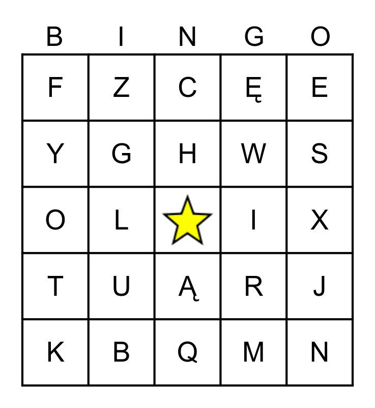 This bingo card has a free space and 29 words: A, B, C, D, E, F, G, H, I, J, K, L, M, N, O, P, Q, R, S, T, U, V, W, X, Y, Z, Ą, Ę and Ś.