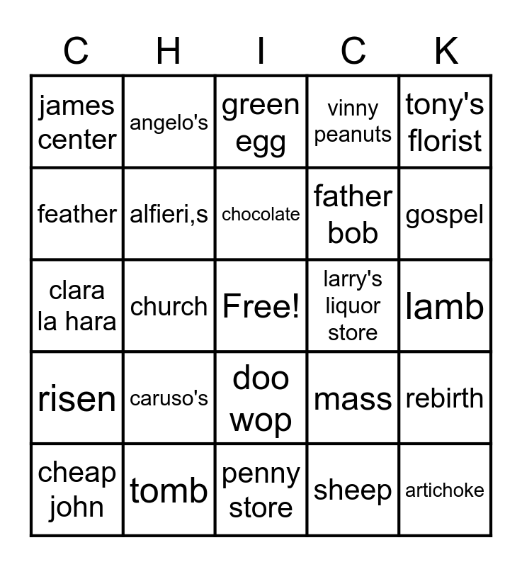 This bingo card has a free space and 75 words: red egg, blue egg, green egg, yellow egg, purple egg, chirp, bread, pasta rustica, antipasto, sunday, dave,s corner, miss booker, chocolate, feather, wine, church, peeps, artichoke, marconi's, tony's florist, city pork, clara la hara, alfieri,s, angelo's, vinny peanuts, chick, basket, candy, jelly beans, eggs, colored eggs, ribbon, flowers, mass, gospel, father bob, cadbury egg, ham, lamb, sheep, lily, tulip, lent, palm, pray, bonnet, cheap john, james center, stick ball, grease pole, skate key, doo wop, lowes canal, pal, graziano's, vitalli's, fettucini, gordina, lupini beans, murray's, caruso's, rossi, merrits, de falco's, paolucci, larry's liquor store, luna, spring, april, rebirth, risen, tomb, cross, penny store and self service.
