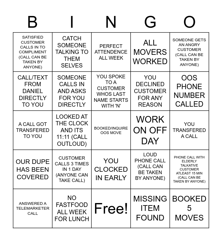 This bingo card has 25 words: OUR DUPE HAS BEEN COVERED, NO FASTFOOD ALL WEEK FOR LUNCH, BOOKED/INQUIRE OOS MOVE, MISSING ITEM FOUND, SOMEONE GETS AN ANGRY CUSTOMER (CALL CAN BE TAKEN BY ANYONE), SATISFIED CUSTOMER CALLS IN TO COMPLIMENT (CALL CAN BE TAKEN BY ANYONE), CATCH SOMEONE TALKING TO THEM SELVES, PERFECT ATTENDENCE ALL WEEK, WORK ON OFF DAY, PHONE CALL WITH ELDERLY TALKATIVE CUSTOMER ATLEAST 15 MIN (CALL CAN BE TAKEN BY ANYONE), CALL/TEXT FROM DANIEL DIRECTLY TO YOU, SOMEONE CALLS IN AND ASKS FOR YOU DIRECTLY, Free!, LOUD PHONE CALL (CALL CAN BE TAKEN BY ANYONE), OOS PHONE NUMBER CALLED, ANSWERED A TELEMARKETER CALL, LOOKED AT THE CLOCK AND ITS 11:11 (CALL OUTLOUD), YOU SPOKE TO A CUSTOMER WHOS LAST NAME STARTS WITH 'N', YOU DECLINED CUSTOMER FOR ANY REASON, YOU TRANSFERED A CALL, A CALL GOT TRANSFERED TO YOU, CUSTOMER CALLS 3 TIMES IN 1 DAY (ANYONE CAN TAKE CALL), YOU CLOCKED IN EARLY, ALL MOVERS WORKED and BOOKED 5 MOVES.