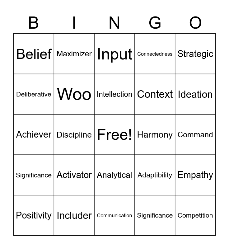 This bingo card has a free space and 34 words: Relator, Significance, Restorative, Responsibility, Significance, Woo, Strategic, Positivity, Maximizer, Learner, Intellection, Input, Individualization, Futuristic, Harmony, Ideation, Includer, Achiever, Activator, Adaptibility, Analytical, Arranger, Belief, Command, Communication, Competition, Connectedness, Consistency, Context, Deliberative, Developer, Discipline, Empathy and Focus.