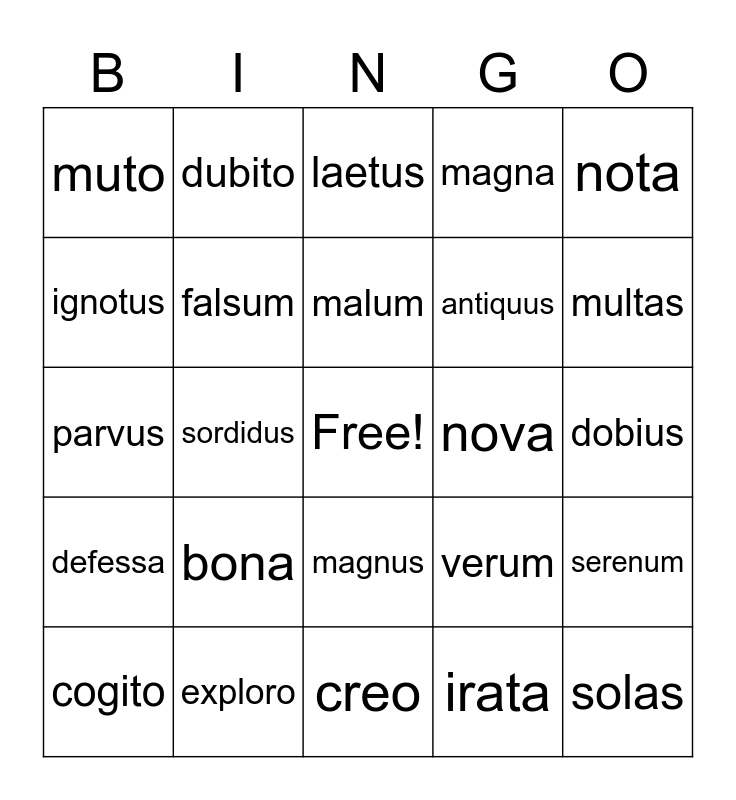 This bingo card has a free space and 24 words: bona, exploro, malum, cogito, nota, muto, ignotus, dubito, nova, magnus, antiquus, parvus, verum, serenum, falsum, irata, dobius, laetus, multas, sordidus, solas, defessa, magna and creo.