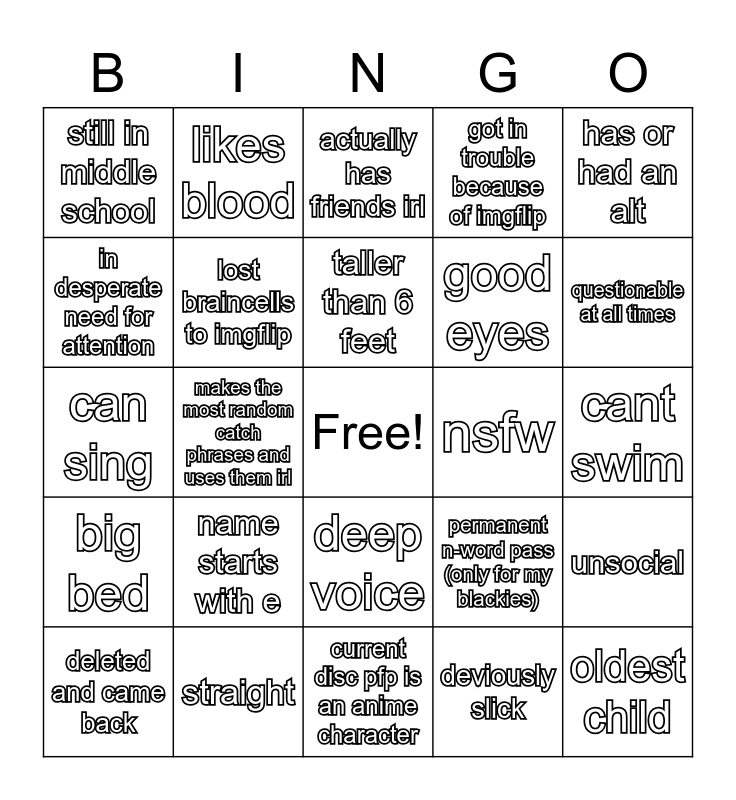 This bingo card has a free space and 24 words: name starts with e, straight, taller than 6 feet, deleted and came back, has or had an alt, still in middle school, in desperate need for attention, likes blood, nsfw, deep voice, good eyes, can sing, permanent n-word pass (only for my blackies), unsocial, lost braincells to imgflip, deviously slick, cant swim, actually has friends irl, questionable at all times, makes the most random catch phrases and uses them irl, oldest child, big bed, got in trouble because of imgflip and current disc pfp is an anime character.