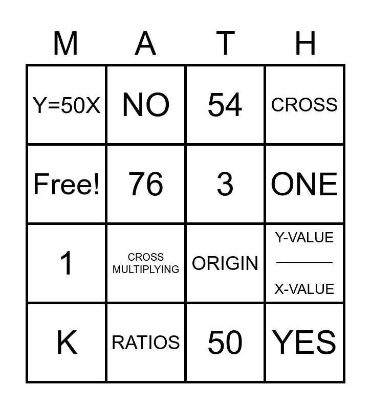This bingo card has 16 words: RATIOS, Y-VALUE _______ X-VALUE, 54, Y=50X, 1, NO, ORIGIN, 50, Free!, 76, K, CROSS, CROSS MULTIPLYING, ONE, 3 and YES.