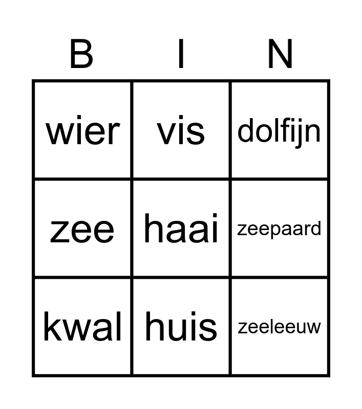 This bingo card has 10 words: huis, dolfijn, wier, haai, zee, kwal, vis, vin, zeepaard and zeeleeuw.