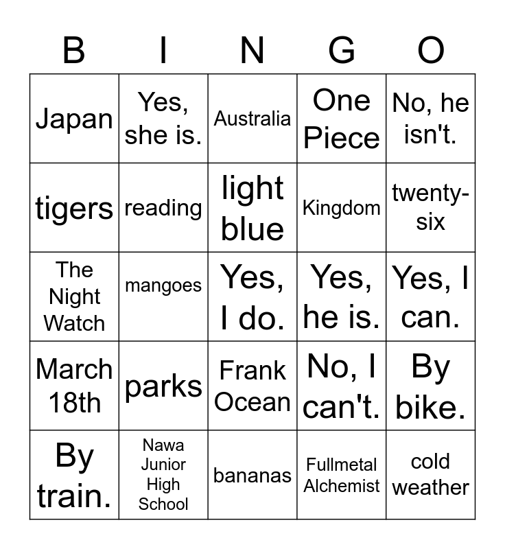 This bingo card has 54 words: The Netherlands, March 18th, thirty, Self Control, Frank Ocean, the beach, One Piece, noodles, tigers, black, Japan, playing video games, Nawa Junior High School, By train., cold weather, bananas, Yes, I do., Kingdom, No, I'm not., Yes, I can., No, I can't., wolf, Yes, he is., No, he isn't., Michael, Yes, she is., May second, lamb chops, Blinding Lights, Fullmetal Alchemist, Castle Hill, Sydney, No, she isn't., blue, bananas, Australia, Hiezu Elementary School, The Night Watch, By bike., cold weather, reading, The Philippines, June 23rd, Shabu-shabu, Halsey, parks, Peppa Pig, Hosshoji Junior High School, dogs, light blue, mangoes, twenty-six, twenty-five, Yes, I am. and No, I don't..