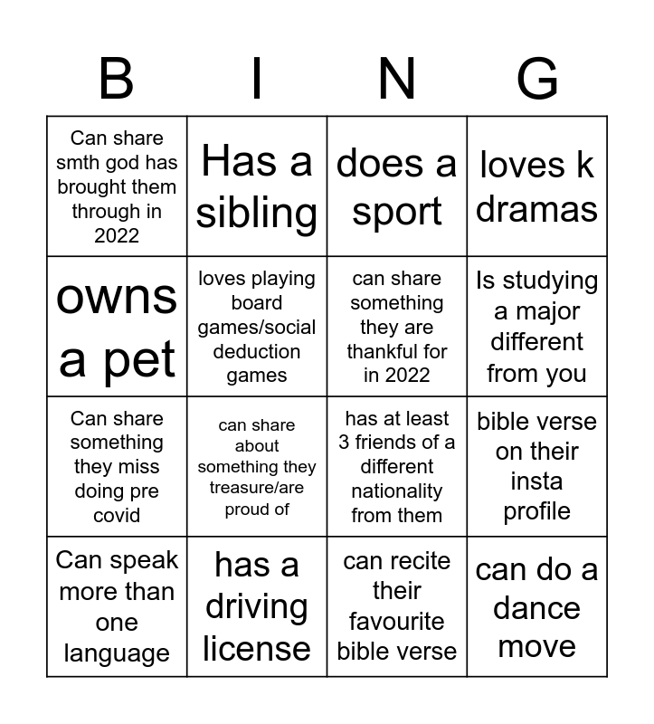 This bingo card has 16 words: Can speak more than one language, has a driving license, does a sport, loves k dramas, owns a pet, Has a sibling, has at least 3 friends of a different nationality from them, bible verse on their insta profile, Can share smth god has brought them through in 2022, loves playing board games/social deduction games, can recite their favourite bible verse, Is studying a major different from you, Can share something they miss doing pre covid, can share about something they treasure/are proud of, can share something they are thankful for in 2022 and can do a dance move.