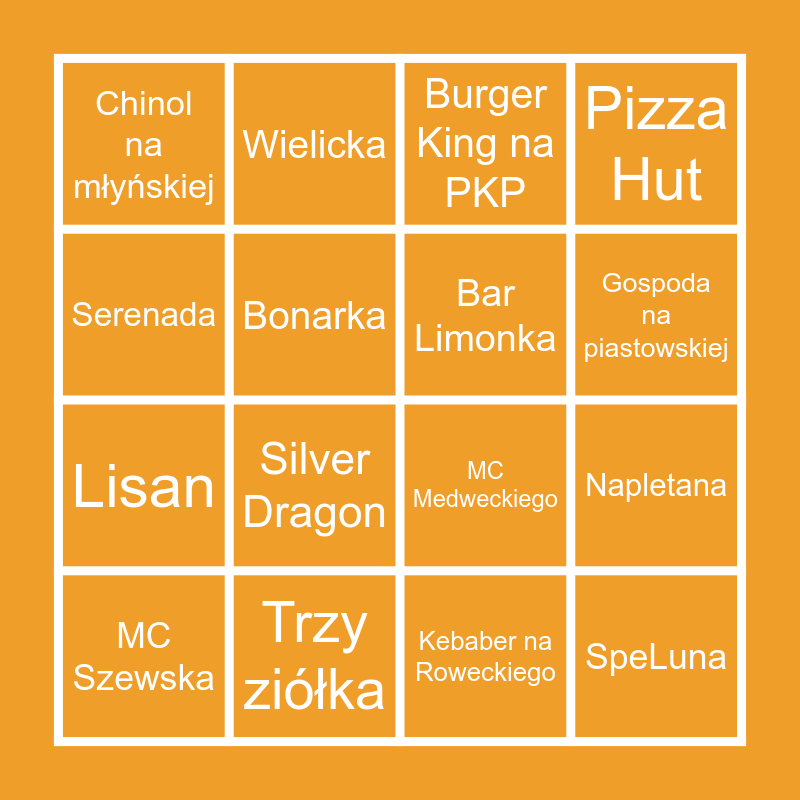 This bingo card has 16 words: Trzy ziółka, Napletana, Burger King na PKP, Chinol na młyńskiej, Lisan, Wielicka, MC Medweckiego, Kebaber na Roweckiego, Serenada, Bonarka, MC Szewska, Pizza Hut, Silver Dragon, Gospoda na piastowskiej, Bar Limonka and SpeLuna.