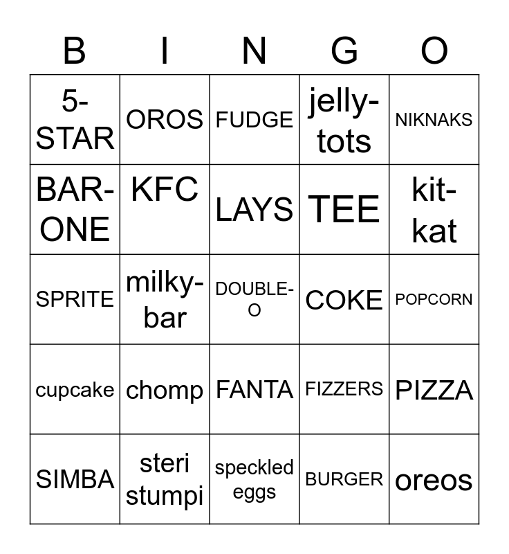 This bingo card has a free space and 24 words: chomp, steri stumpi, LAYS, SIMBA, NIKNAKS, 5-STAR, BAR-ONE, OROS, COKE, FANTA, TEE, SPRITE, FIZZERS, PIZZA, KFC, BURGER, POPCORN, FUDGE, kit-kat, milky-bar, oreos, cupcake, jelly-tots and speckled eggs.