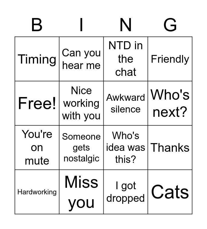 This bingo card has 16 words: Miss you, Thanks, NTD in the chat, Timing, You're on mute, Can you hear me, Who's idea was this?, I got dropped, Free!, Nice working with you, Hardworking, Friendly, Someone gets nostalgic, Who's next?, Awkward silence and Cats.