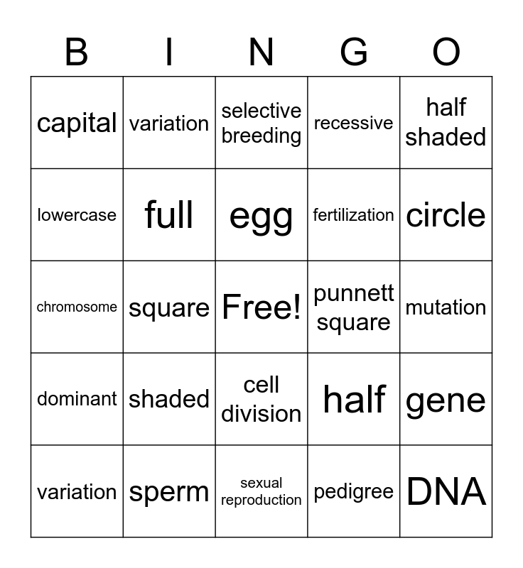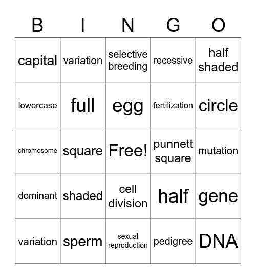 This bingo card has a free space and 24 words: shaded, sperm, egg, variation, half shaded, capital, lowercase, variation, punnett square, cell division, fertilization, chromosome, half, gene, full, pedigree, mutation, selective breeding, circle, square, DNA, dominant, recessive and sexual reproduction.