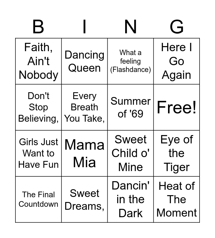 This bingo card has 64 words: ‘Maneater, Addicted to Love, Another One Bites the Dust,, Back in Black, Beat It, Billie Jean,, Dancing Queen, Call Me, Livin' on a Prayer,, Free!, Cherry Pie, Careless Whisper, Can’t Fight This Feeling, Dancin' in the Dark, Don't Stop Believing,, Down Under, Every Breath You Take,, Eye of the Tiger, Faith, Ain't Nobody, Free Fallin', Girls Just Want to Have Fun, Money for Nothing, Heat of The Moment, Here I Go Again, How Will I Know, Hungry Like A Wolf, I Wanna Dance w/ Some-body, Into the Groove, 80’ini, Working 9 to 5, Love is a Battlefield, Love Shack, Never Gonna Give You Up, Papa Don't Preach,, Pour Some Sugar on Me, Mama Mia, Rock You Like a Hurricane., Sledge-hammer, Should I Stay or Should I Go, Mustang Sally, Summer of '69, Sweet Child o' Mine, Sweet Dreams,, Tainted Love, Take on Me, Til Allar Vinir, The Final Countdown, Time After Time, You Shook Me All Night Long, Under Pressure, I´m so excited, We're Not Gonna Take It, Radio Ga Ga, Why Can't This Be Love,, We Didn’t Start The fire, With or Without You, Margaritaville, What a feeling (Flashdance), 99 luftballon, I´m gonna be (500 miles), Total eclipse of the heart, Gimme gimme gimme, White wedding, Purple Rain and Dirty Diana.