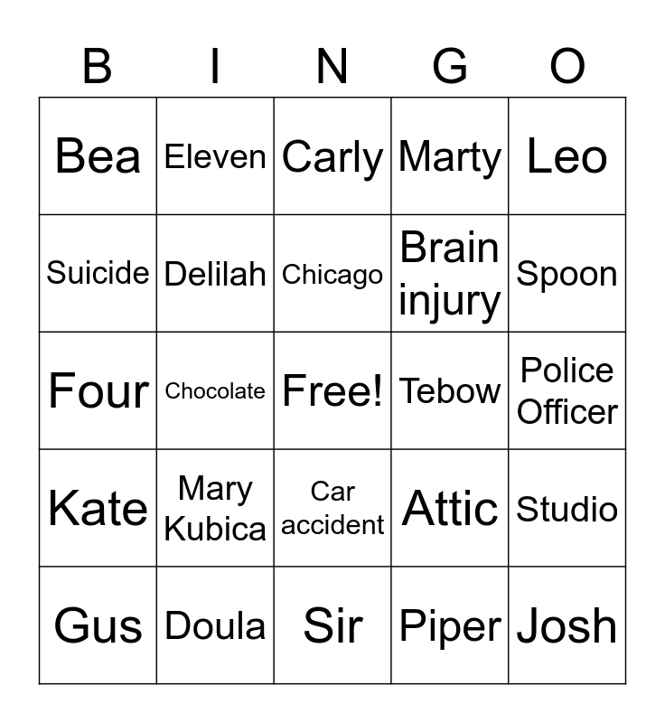 This bingo card has a free space and 24 words: Mary Kubica, Doula, Chicago, Gus, Leo, Bea, Suicide, Eleven, Tebow, Car accident, Brain injury, Four, Attic, Studio, Delilah, Piper, Police Officer, Carly, Spoon, Chocolate, Josh, Kate, Marty and Sir.