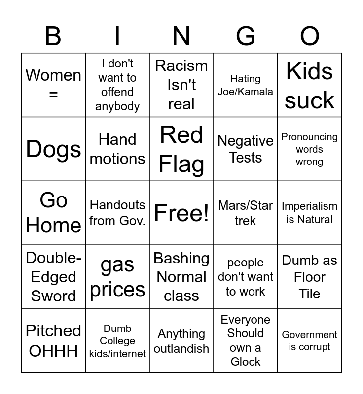 This bingo card has a free space and 28 words: Dumb as Floor Tile, Back in the good old days, Negative Tests, Everyone Should own a Glock, Dogs, Racism Isn't real, I don't want to offend anybody, Double-Edged Sword, Mars/Star trek, Pitched OHHH, Go Home, Hating Joe/Kamala, Dumb College kids/internet, Anything outlandish, Pronouncing words wrong, Climate change isn't real, gas prices, Hand motions, Red Flag, Bashing Normal class, Women =, Duck analogy, Government is corrupt, Handouts from Gov., Imperialism is Natural, people don't want to work, Kids suck and Diversity=bad.