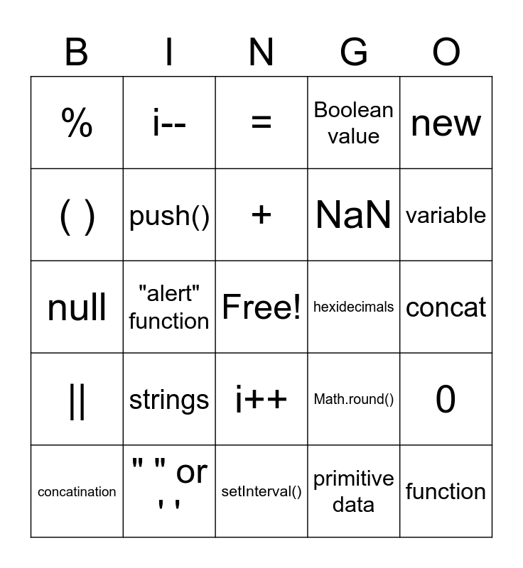 This bingo card has a free space and 24 words: strings, " " or ' ', +, concatination, new, %, ( ), i--, hexidecimals, i++, NaN, null, Math.round(), 0, push(), primitive data, concat, =, variable, "alert" function, function, ||, Boolean value and setInterval().