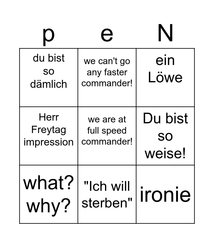 This bingo card has a free space and 8 words: Du bist so weise!, ein Löwe, we can't go any faster commander!, what? why?, du bist so dämlich, ironie, Herr Freytag impression and "Ich will sterben".