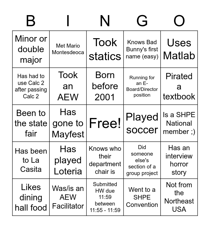 This bingo card has a free space and 41 words: Been to Las Delicias, Been to the state fair, Has done undergraduate research, Took an AEW, Was/is an AEW Facilitator, Knows who their department chair is, Born before 2001, Didn't live in Shaw their first year, Uses Matlab, Has been to La Casita, Has gone to Mayfest, Knows Bad Bunny's first name (easy), Not from the Northeast USA, Is a SHPE National member ;), Played soccer, Has played Loteria, Knows the original language "avocado" comes from, Minor or double major, Has/had an 8 AM, Took statics, Has an interview horror story, Knows how to get to Slocum from Link without going outside, Submitted HW due 11:59 between 11:55 - 11:59, Running for an E-Board/Director position, Has a cumulative final exam, Has programmed an Arduino, Went to a SHPE Convention, Has less than 25 people in their major, Pirated a textbook, Can explain their major in 5 words or less, Got a 0 on a lab/exam/homework, Met Mario Montesdeoca, Likes dining hall food, Follows an engineering memes insta, Did someone else's section of a group project, Has had to use Calc 2 after passing Calc 2, Switched majors, Taking 16 or less credits this semester, Gone to Link on the weekend, Can name an engineer other than Elon/Bill/Nikola and Can name an alum of ECS that worked at NASA.