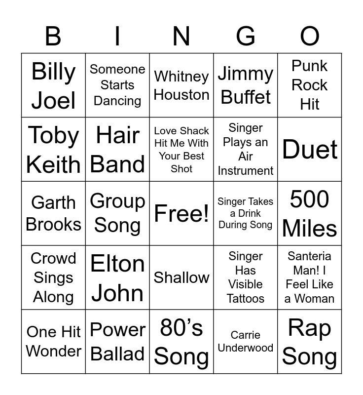 This bingo card has a free space and 88 words: Sweet Caroline, Tennessee Whiskey, Shallow, Friends In Low Places, Don’t Stop Believin’, Dreams, What’s Up, Goodbye Earl, I Want It That Way, Wagon Wheel, Zombie, Jolene, Santeria Man! I Feel Like a Woman, 500 Miles, Dancing Queen, Love Shack Hit Me With Your Best Shot, Baby Got Back, Brown Eyed Girl, Sweet Child o’ Mine, Ed Sheeran, Adele, Alanis Morissette, Garth Brooks, Journey, Carrie Underwood, Brooks & Dunn, Queen Fleetwood Mac Johnny Cash, Elvis, Shania Twain, Dixie Chicks, Whitney Houston, Jimmy Buffet, Bon Jovi, Reba McIntire, Elton John, Toby Keith, Billy Joel, Pat Benatar, Singer is a Kid, Duet, Group Song, Singer Has Glasses, Singer Has a Beard, Singer Has Visible Tattoos, Singer Takes a Drink During Song, Singer Is Wearing a Hat, Singer Is Wearing Cowboy Boots, Singer Stops Singing/Gets Lost, Singer Ad-Libs/Changes Words, Singer Plays an Air Instrument, Singer Dedicates a Song To Someone, Staff Member Sings a Song, Reluctant Singer: Signed Up By a Friend, Singer Talks During Instrumental Break, Crowd Politely Claps, Crowd Enthusiastically Claps, Crowd Sings Along, Someone Starts Dancing, Someone Whistles, Someone Says “I LOVE THIS SONG!” Someone Says “I hate this song!”, Staff Member Sings a Song, Crowd Claps Along, Crowd Response Song, Disney, Broadway/Musical, Power Ballad, Boy Band, Hair Band, One Hit Wonder, Rap Song, Classic Rock Song Alt Rock Song, Pop Song, Female Rocker, Punk Rock Hit, Country Tune, 50’s Song, 60’s Song, 70’s Song, 80’s Song, 90’s Song, 00’s Song, Love Song, Breakup Song, Party Anthem, Song About a Location, Song About Drinking, Song About Friends and Song With a Name In the Title.