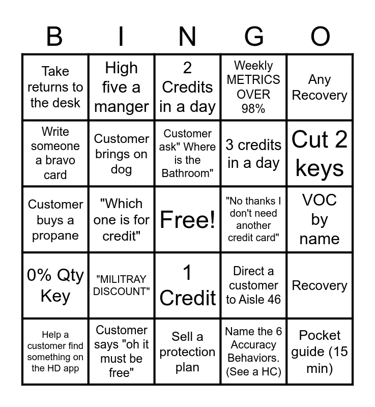 This bingo card has a free space and 24 words: "MILITRAY DISCOUNT", Customer says "oh it must be free", Customer ask" Where is the Bathroom", Help a customer find something on the HD app, Any Recovery, Take returns to the desk, Write someone a bravo card, High five a manger, "No thanks I don't need another credit card", 1 Credit, 3 credits in a day, Customer buys a propane, Direct a customer to Aisle 46, Recovery, Customer brings on dog, Name the 6 Accuracy Behaviors. (See a HC), VOC by name, 2 Credits in a day, Cut 2 keys, "Which one is for credit", Pocket guide (15 min), 0% Qty Key, Weekly METRICS OVER 98% and Sell a protection plan.