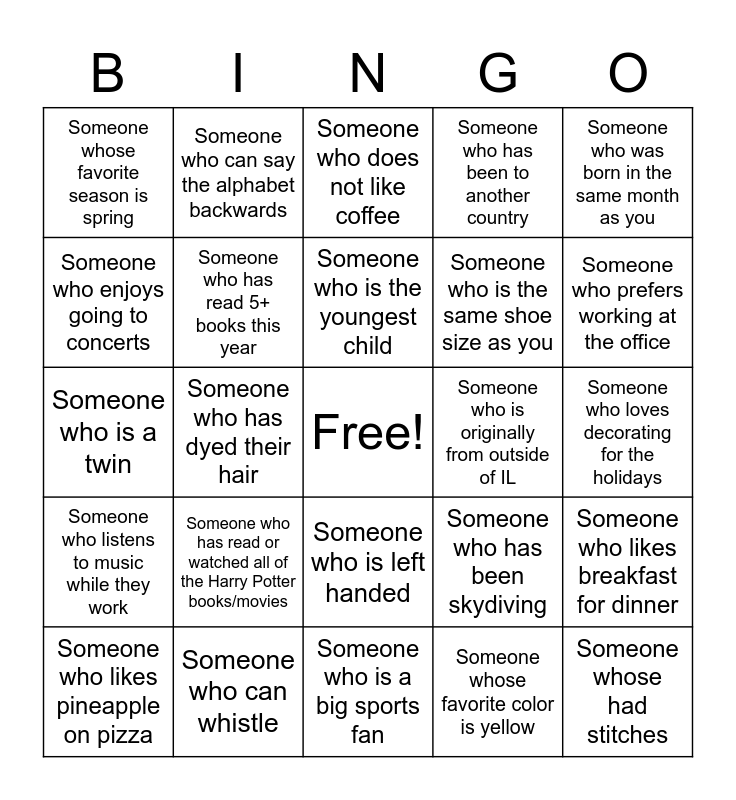 This bingo card has a free space and 34 words: Someone who is a picky eater, Someone whose favorite color is yellow, Someone who has has a bucket list, Someone who is competitive, Someone who listens to music while they work, Someone who has read 5+ books this year, Someone who was born in the same month as you, Someone who likes pineapple on pizza, Someone who can say the alphabet backwards, Someone who has an unusual talent, Someone who is the youngest child, Someone who does not like coffee, Someone who has a pet that is not a dog or cat, Someone who loves karaoke, Someone who is originally from outside of IL, Someone who prefers working at the office, Someone who can whistle, Someone who is a twin, Someone who has read or watched all of the Harry Potter books/movies, Someone who has been skydiving, Someone who is left handed, Someone who speaks multiple languages, Someone whose favorite season is spring, Someone who loves decorating for the holidays, Someone who is a big sports fan, Someone whose had stitches, Someone who has been to another country, Someone who is a morning person, Someone who is the same shoe size as you, Someone who enjoys going to concerts, Someone who loves ice cream, Someone who has dyed their hair, Someone who likes breakfast for dinner and Someone who plays a musical instrument.