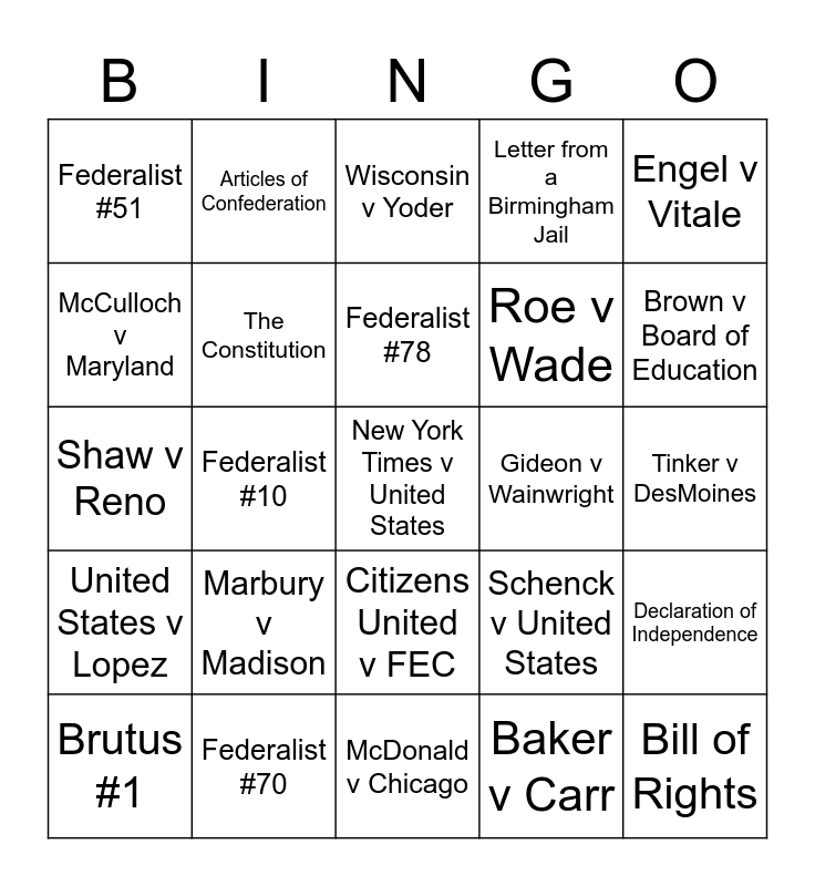 This bingo card has 25 words: Marbury v Madison, McDonald v Chicago, Federalist #78, Brutus #1, Engel v Vitale, Federalist #51, McCulloch v Maryland, Articles of Confederation, Gideon v Wainwright, Citizens United v FEC, Roe v Wade, Shaw v Reno, Schenck v United States, Declaration of Independence, The Constitution, Bill of Rights, Tinker v DesMoines, Wisconsin v Yoder, Brown v Board of Education, Federalist #10, New York Times v United States, Federalist #70, United States v Lopez, Letter from a Birmingham Jail and Baker v Carr.
