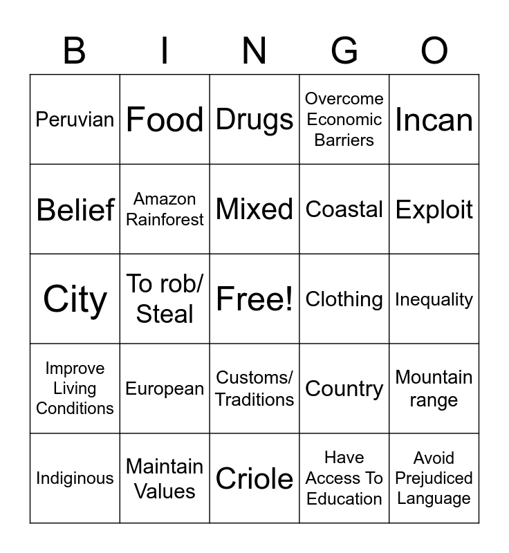 This bingo card has a free space and 25 words: European, Criole, Mixed, Indiginous, Incan, Peruvian, Belief, Food, Clothing, Customs/ Traditions, Coastal, City, Country, Mountain range, Amazon Rainforest, Crime, Inequality, Drugs, Exploit, To rob/ Steal, Avoid Prejudiced Language, Maintain Values, Improve Living Conditions, Overcome Economic Barriers and Have Access To Education.