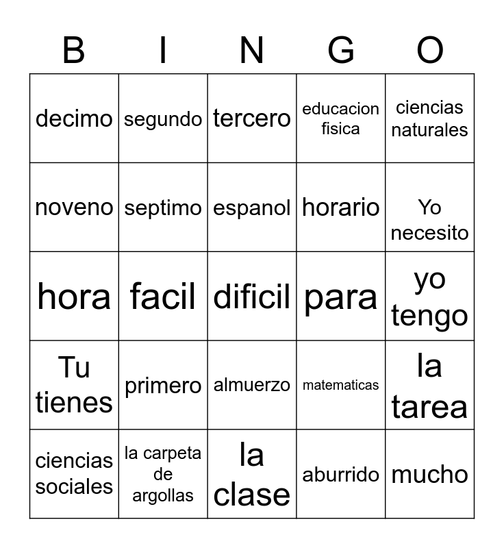 This bingo card has 25 words: primero, la clase, espanol, ciencias sociales, ciencias naturales, decimo, noveno, segundo, para, almuerzo, horario, hora, matematicas, la tarea, septimo, mucho, yo tengo, tercero, Yo necesito, facil, dificil, la carpeta de argollas, Tu tienes, educacion fisica and aburrido.