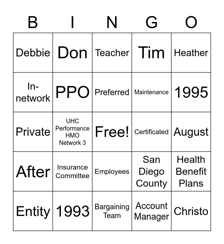 This bingo card has a free space and 44 words: CTA, Christo, Katherine, Entity, Alma, Account Manager, Teacher, CSEA, Heather, 1993, Tim, Certificated, Employees, Insurance Committee, VEBA Ombudsman, Bargaining Team, Technology, Private, Matt, 1995, Don, Classified, School Board Members, Debbie, Public, August, Before, Resource Center Information, San Diego County, After, December, Health Benefit Plans, 56, Out-of-network, UHC Performance HMO Network 3, 20, Medical Groups, Management, Preferred, In-network, Maintenance, Protection, PPO and On-site flu shot clinics.