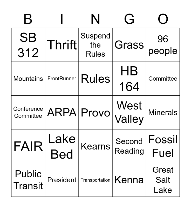 This bingo card has a free space and 191 words: Free!, Bingo Card words, Clean energy, Clean Air, Air Quality, Radioactive Waste, PM 2.5, Logan, Winter, Summer, NOx, VOCs, Ozone, Sunshine, West Valley, Salt Lake City, Kearns, Ogden, West Jordan, Vehicle emissions, Area Source Emissions, Industry Emissions, Carbon Pollution, Carbon Tax, Fossil Fuel, Coal, Transition, Renewable Energy, Carbon Dioxide, Wildfire, Reduce Carbon Emissions, Advance Renewables, Advance Large-Scale Renewables, Uranium Mine, Southeastern, Downwinder, Nuclear Weapon, Nuclear Energy, Toxic Waste, Waste Disposal, Waste Generation, High-Level Waste, Meisei, Alex, Lexi, Kenna, Turner, Jordan, SB 188, SB 186, SB 312, HB 272, WITE MESA, RECA, HOA, SB 136, Electric Vehicles, Public Transit, Trains, Buses, FrontRunner, Save Our Great Salt Lake, HEAL Utah, Interim, HB 405, HB 164, Senate Concurrent Resolution 3, Great Salt Lake, HB 410, ARPA, HB 157, HB 33, Lake Bed, Citizen Lobby, Action alert, 300 lawmakers, 96 people, Virtually, Adjornment, Amendment, Appropriation, Bill, Budget, Calendar, Caucus, Circle a Bill, Code, Committee, Concurrence, Concurrent resolution, Conference Committee, Enacting Clause, Enrolled Bill, Fiscal Note, Fiscal Year, Floor, Hearing, Joint Resolution, Lobbyist, President, Reading, First Reading, Second Reading, Regulation, Resolution, Rules, Sine Die, Speaker, Sponsor, Standing Committee, Substitute Bill, Suspend the Rules, Veto, Whip, Table a Bill, Squatters, Depleted Uranium, FAIR, Environmental Justice, Climate Change, Utah Legislator, Legislation, Capitol, Governor, Social Justice, Green Merch, Compost, Recyle, Reuse, Reduce, Carpool, Industry, Agriculture, Soil, Earth, Clouds, Tree, Sunflower, Grass, Oil, Gas, Production, Solar Panels, Wind Turbine, Power Plant, Coal Plant, Nonprofit, Merchandise, Stickers, T-Shirt, Thrift, Diesel Emissions, Utah Transit Authority, Trax, Train, Transportation, Smart Growth, Sustainable, Green, HEAL, Healthy Environment Alliance of Utah, Executive Director, Policy Associate, Communications, Grassroots, Civic Engagement, VOTE!, Take Action, Environmental Activism, Activist, Climate Strike, Event, Healutah.org, Website, 20 Years, 14,000, Rivers, Mountains, Lakes, Clouds, Lithium, Essential, Minerals, Electricity, Grid, Electric grid, Local, Roads, Bike, Vegan and Intersectional.