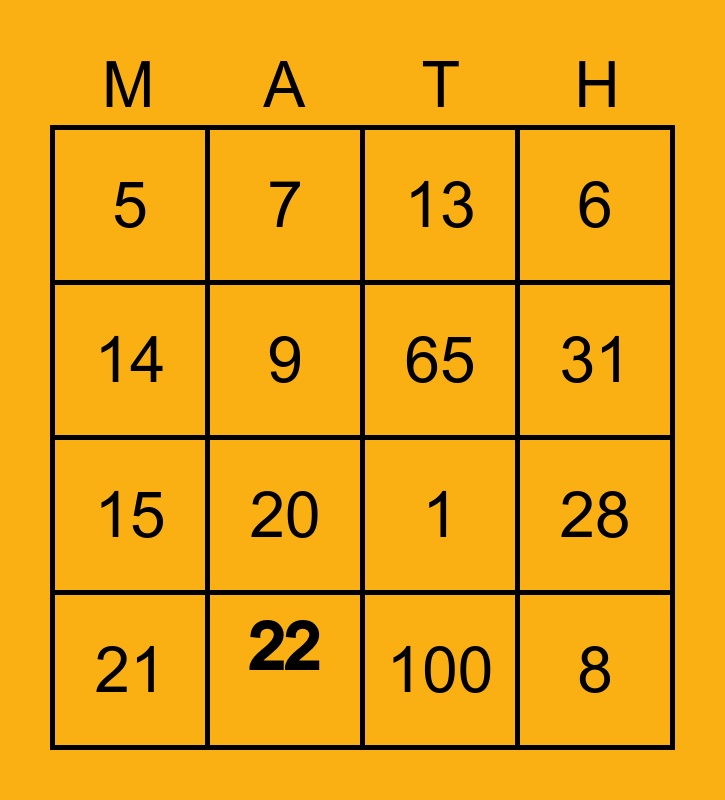 This bingo card has 16 words: 22, 28, 13, 5, 15, 7, 1, 100, 14, 9, 21, 6, 20, 31, 65 and 8.