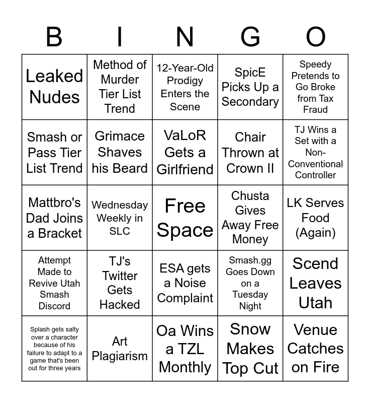 This bingo card has a free space and 24 words: TJ's Twitter Gets Hacked, Art Plagiarism, VaLoR Gets a Girlfriend, Splash gets salty over a character because of his failure to adapt to a game that's been out for three years, Speedy Pretends to Go Broke from Tax Fraud, Leaked Nudes, Smash or Pass Tier List Trend, Method of Murder Tier List Trend, Chusta Gives Away Free Money, ESA gets a Noise Complaint, Chair Thrown at Crown II, Mattbro's Dad Joins a Bracket, Smash.gg Goes Down on a Tuesday Night, Scend Leaves Utah, Grimace Shaves his Beard, Snow Makes Top Cut, LK Serves Food (Again), 12-Year-Old Prodigy Enters the Scene, TJ Wins a Set with a Non-Conventional Controller, Wednesday Weekly in SLC, Venue Catches on Fire, Attempt Made to Revive Utah Smash Discord, SpicE Picks Up a Secondary and Oa Wins a TZL Monthly.