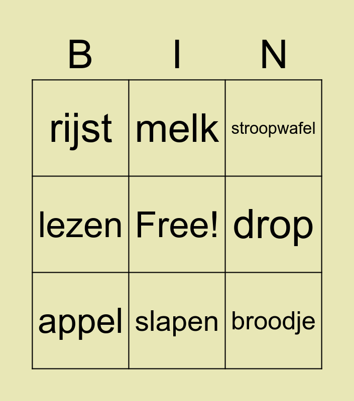 This bingo card has a free space and 8 words: drop, stroopwafel, melk, appel, rijst, broodje, lezen and slapen.