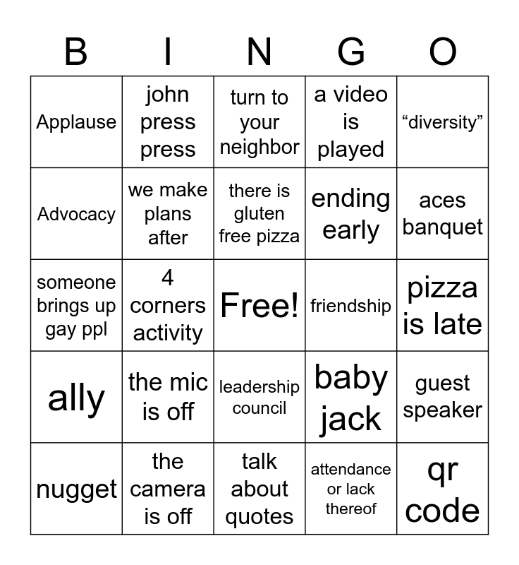 This bingo card has a free space and 24 words: the mic is off, the camera is off, there is gluten free pizza, nugget, “diversity”, Applause, Advocacy, john press press, friendship, leadership council, ending early, someone brings up gay ppl, baby jack, guest speaker, we make plans after, attendance or lack thereof, pizza is late, turn to your neighbor, aces banquet, 4 corners activity, qr code, ally, a video is played and talk about quotes.