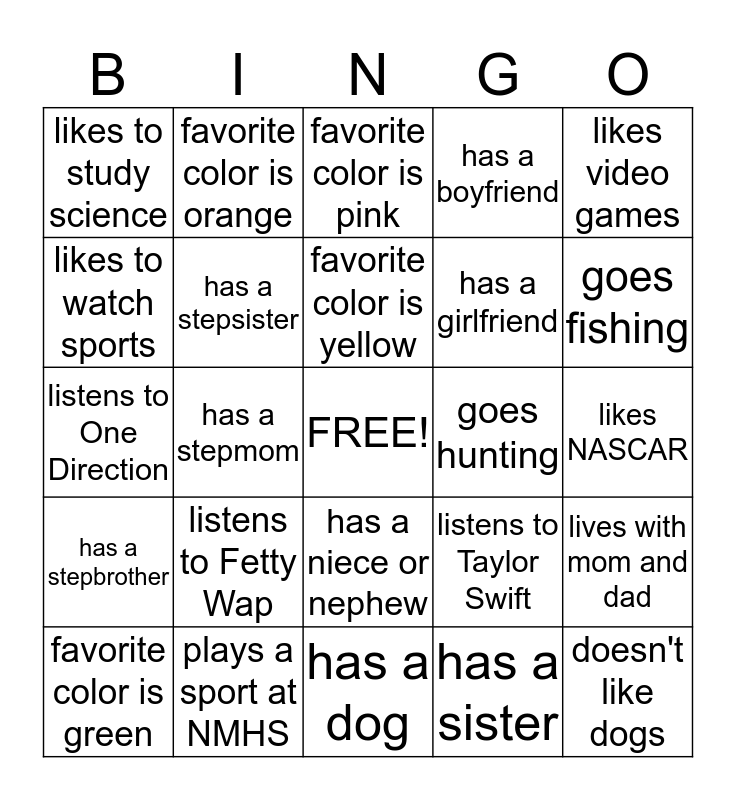 This bingo card has a free space and 33 words: has a cat, doesn't like cats, has a stepmom, has a stepdad, has a stepbrother, has a stepsister, likes video games, favorite color is green, favorite color is orange, favorite color is purple, favorite color is yellow, favorite color is pink, favorite color is red, favorite color is blue, goes hunting, goes fishing, plays a sport at NMHS, listens to One Direction, listens to Fetty Wap, listens to Taylor Swift, has a niece or nephew, likes to study math, likes to study science, likes NASCAR, has a dog, doesn't like dogs, has a boyfriend, has a girlfriend, likes to watch sports, lives with mom and dad, has a brother, has a sister and likes beef jerky.