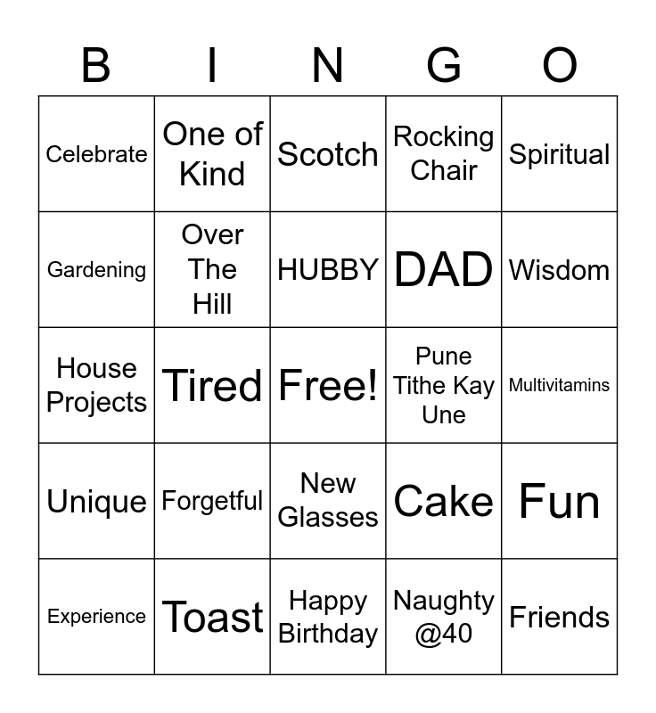 This bingo card has a free space and 31 words: Happy Birthday, Bayako Geli Maheri, Tired, 40 is new 20, Celebrate, Scotch, Over The Hill, Cake, Pune Tithe Kay Une, Naughty @40, Multivitamins, Friends, Mid Life, Special, Wisdom, Memories, Fun, Forgetful, Unique, New Glasses, Spiritual, Witty, Experience, One of Kind, DAD, Gardening, Rocking Chair, House Projects, Toast, HUBBY and Fantastic.
