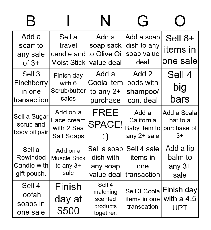 This bingo card has a free space and 24 words: Add on a Muscle Stick to any 3+ sale, Finish day at $500, Add a Coola item to any 2+ purchase, Sell 4 loofah soaps in one sale, Sell 8+ items in one sale, Add a scarf to any sale of 3+, Sell 3 Finchberry in one transaction, Sell a travel candle and Moist Stick, Add a California Baby item to any 2+ sale, Sell a soap dish with any soap value deal, Add 2 pods with shampoo/ con. deal, Sell a Sugar scrub and body oil pair, Sell 4 sale items in one transaction, Add a lip balm to any 3+ sale, Finish day with 6 Scrub/butter sales, Sell 3 Coola items in one transcation, Add a Scala hat to a purchase of 3+, Add a soap sack to Olive Oil value deal, Sell 4 big bars, Add on a Face cream with 2 Sea Salt Soaps, Finish day with a 4.5 UPT, Sell a Rewinded Candle with gift pouch., Add a soap dish to any soap value deal and Sell 4 matching scented products together..