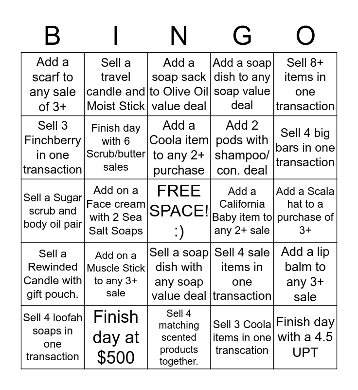 This bingo card has a free space and 24 words: Add on a Muscle Stick to any 3+ sale, Finish day at $500, Add a Coola item to any 2+ purchase, Sell 4 loofah soaps in one transaction, Sell 8+ items in one transaction, Add a scarf to any sale of 3+, Sell 3 Finchberry in one transaction, Sell a travel candle and Moist Stick, Add a California Baby item to any 2+ sale, Sell a soap dish with any soap value deal, Add 2 pods with shampoo/ con. deal, Sell a Sugar scrub and body oil pair, Sell 4 sale items in one transaction, Add a lip balm to any 3+ sale, Finish day with 6 Scrub/butter sales, Sell 3 Coola items in one transcation, Add a Scala hat to a purchase of 3+, Add a soap sack to Olive Oil value deal, Sell 4 big bars in one transaction, Add on a Face cream with 2 Sea Salt Soaps, Finish day with a 4.5 UPT, Sell a Rewinded Candle with gift pouch., Add a soap dish to any soap value deal and Sell 4 matching scented products together..