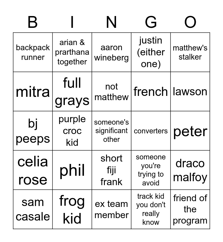 This bingo card has a free space and 24 words: phil, frog kid, not matthew, sam casale, matthew's stalker, backpack runner, mitra, arian & prarthana together, converters, short fiji frank, french, bj peeps, someone you're trying to avoid, draco malfoy, full grays, track kid you don't really know, peter, aaron wineberg, lawson, purple croc kid, friend of the program, celia rose, justin (either one) and ex team member.