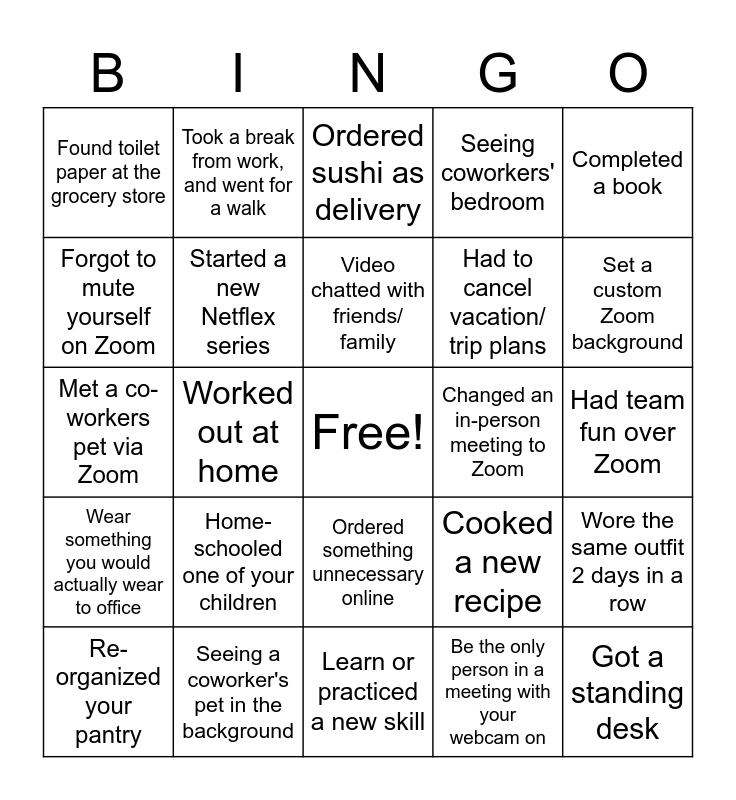 This bingo card has a free space and 25 words: Home-schooled one of your children, Learn or practiced a new skill, Video chatted with friends/ family, Re-organized your pantry, Completed a book, Found toilet paper at the grocery store, Forgot to mute yourself on Zoom, Took a break from work, and went for a walk, Changed an in-person meeting to Zoom, Ordered something unnecessary online, Had to cancel vacation/ trip plans, Met a co-workers pet via Zoom, Cooked a new recipe, Wore the same outfit 2 days in a row, Started a new Netflex series, Disinfected your computer equipment, Had team fun over Zoom, Ordered sushi as delivery, Set a custom Zoom background, Worked out at home, Got a standing desk, Seeing a coworker's pet in the background, Wear something you would actually wear to office, Seeing coworkers' bedroom and Be the only person in a meeting with your webcam on.