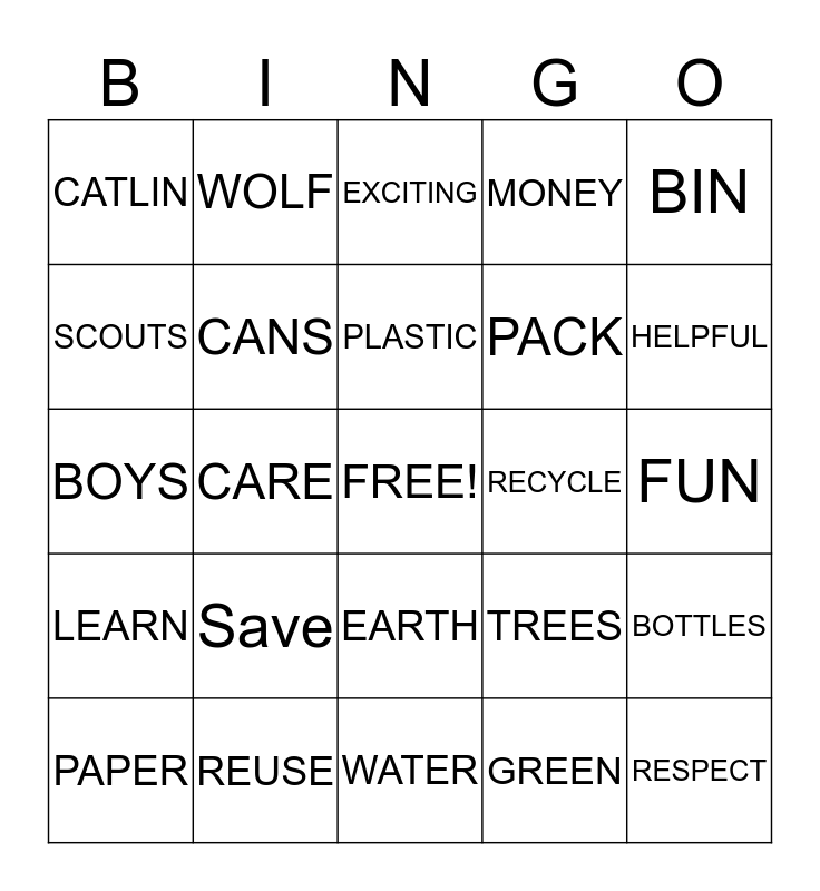 This bingo card has a free space and 24 words: Save, REUSE, PLASTIC, PAPER, BIN, CATLIN, SCOUTS, WOLF, RECYCLE, EARTH, PACK, BOYS, TREES, BOTTLES, CANS, GREEN, FUN, EXCITING, HELPFUL, CARE, RESPECT, LEARN, MONEY and WATER.