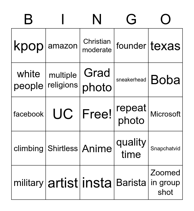 This bingo card has a free space and 42 words: Games, Grad photo, Man, Shirtless, Barista, Snapchatvid, Zoomed in group shot, Mediocre cooking, Christian moderate, Anime, Microsoft, Boba, UC, texas, tequila, quality time, korean men, facebook, asian tourist attraction, amazon, white people, bay area, moderate, kpop, gym shot, car, sneakerhead, prof photos, polyglot, no desc, rave, climbing, multiple religions, insta, “spontaneous”, military, artist, repeat photo, crypto, cherry blossom shot, founder and music.