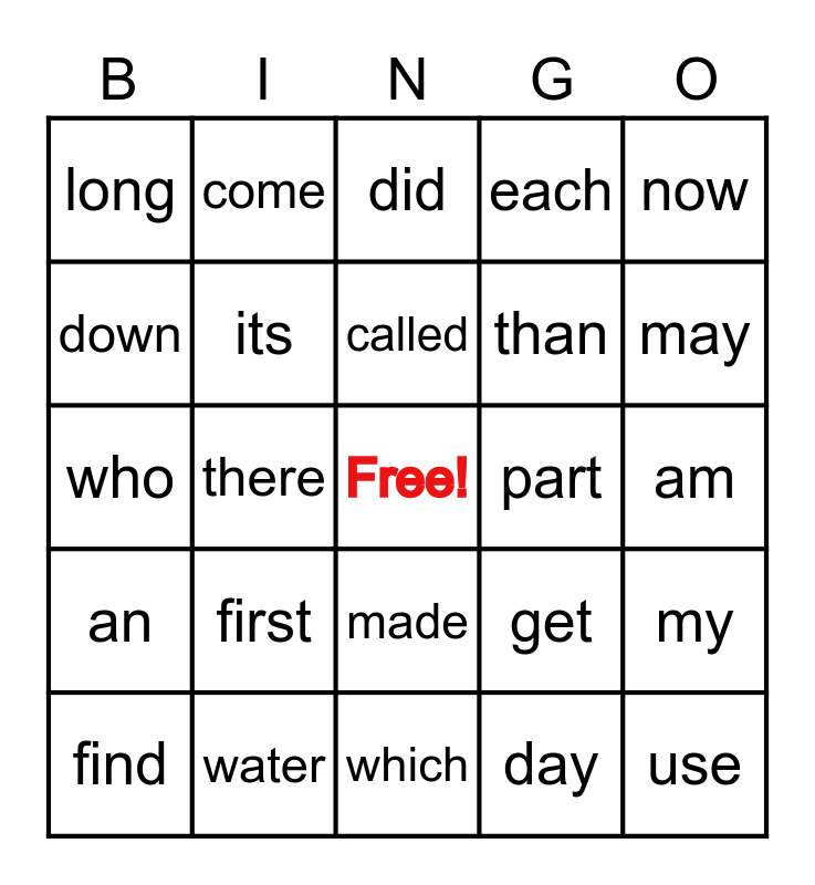 This bingo card has a free space and 24 words: first, water, called, find, now, long, down, come, part, made, than, who, get, my, its, day, am, did, may, there, use, an, each and which.