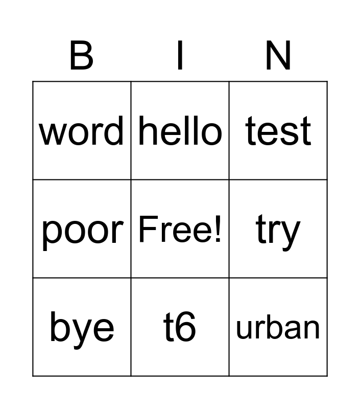 This bingo card has a free space and 8 words: try, test, hello, bye, word, urban, poor and t6.