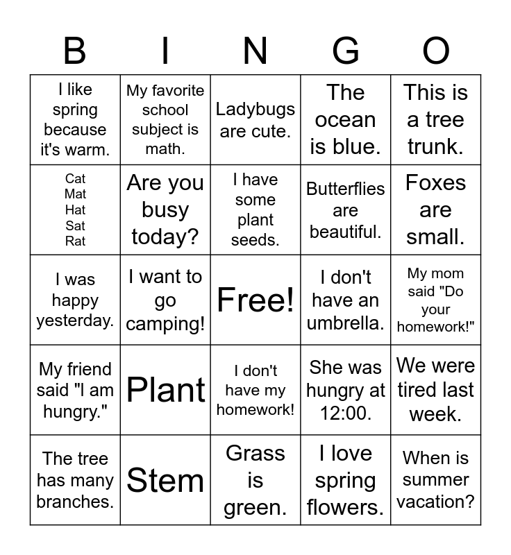 This bingo card has a free space and 24 words: Plant, Stem, I have some plant seeds., The tree has many branches., This is a tree trunk., I like spring because it's warm., Cat Mat Hat Sat Rat, My favorite school subject is math., I don't have an umbrella., I don't have my homework!, Butterflies are beautiful., I was happy yesterday., She was hungry at 12:00., We were tired last week., Are you busy today?, I love spring flowers., My mom said "Do your homework!", Ladybugs are cute., Foxes are small., I want to go camping!, When is summer vacation?, My friend said "l am hungry.", The ocean is blue. and Grass is green..