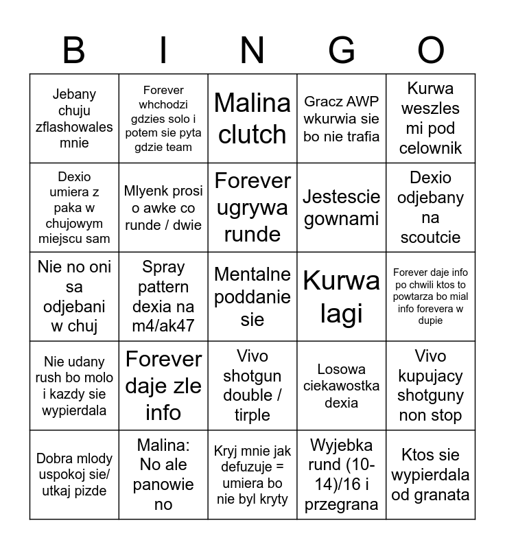 This bingo card has a free space and 24 words: Forever daje zle info, Malina: No ale panowie no, Forever ugrywa runde, Dobra mlody uspokoj sie/ utkaj pizde, Kurwa weszles mi pod celownik, Jebany chuju zflashowales mnie, Dexio umiera z paka w chujowym miejscu sam, Forever whchodzi gdzies solo i potem sie pyta gdzie team, Kurwa lagi, Vivo shotgun double / tirple, Jestescie gownami, Nie no oni sa odjebani w chuj, Losowa ciekawostka dexia, Vivo kupujacy shotguny non stop, Mlyenk prosi o awke co runde / dwie, Wyjebka rund (10-14)/16 i przegrana, Forever daje info po chwili ktos to powtarza bo mial info forevera w dupie, Malina clutch, Dexio odjebany na scoutcie, Spray pattern dexia na m4/ak47, Ktos sie wypierdala od granata, Nie udany rush bo molo i kazdy sie wypierdala, Gracz AWP wkurwia sie bo nie trafia and Kryj mnie jak defuzuje = umiera bo nie byl kryty.