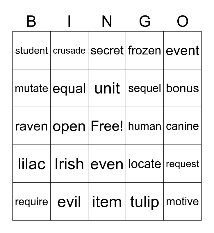 This bingo card has a free space and 31 words: item, menu, open, bingo, student, secret, equal, locate, human, tulip, canine, motive, motto, pupil, bonus, minus, request, Irish, lilac, even, event, silent, require, crusade, sequel, mutate, frozen, raven, evil, unit and unite.