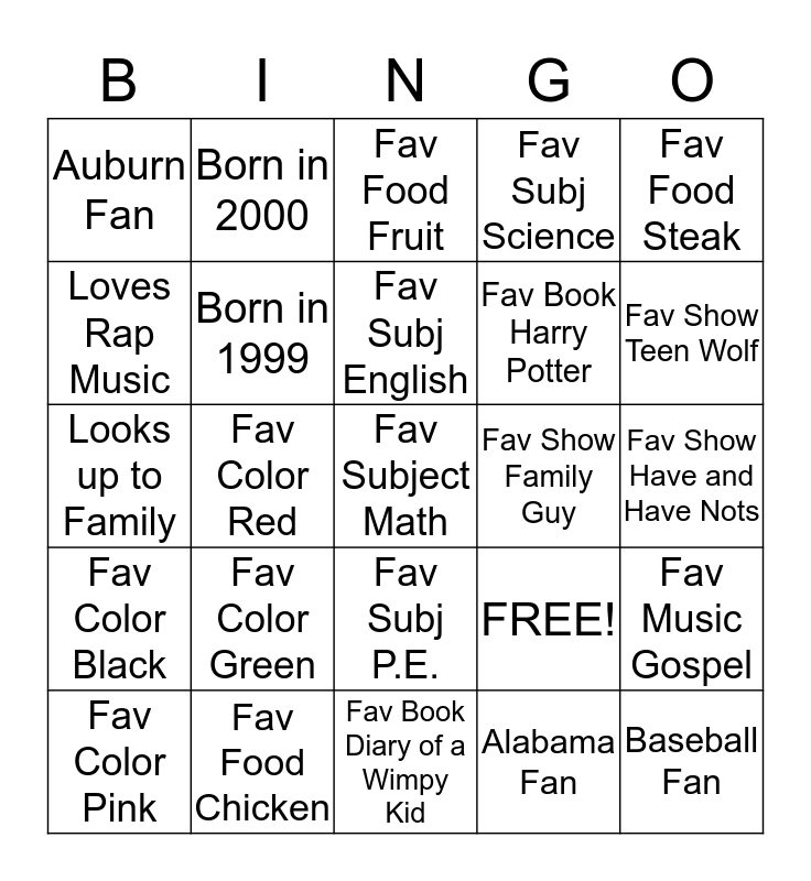This bingo card has 25 words: Fav Color Green, Fav Book Diary of a Wimpy Kid, Fav Subj English, Fav Color Pink, Fav Food Steak, Auburn Fan, Loves Rap Music, Born in 2000, Fav Show Family Guy, Fav Subj P.E., Fav Book Harry Potter, Looks up to Family, FREE!, Fav Music Gospel, Born in 1999, Baseball Fan, Fav Show Have and Have Nots, Fav Food Fruit, Fav Show Teen Wolf, Fav Color Red, Fav Subject Math, Fav Food Chicken, Fav Color Black, Fav Subj Science and Alabama Fan.