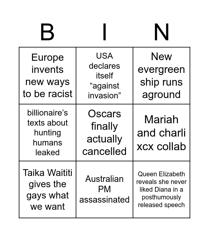 This bingo card has 9 words: Taika Waititi gives the gays what we want, New evergreen ship runs aground, USA declares itself “against invasion”, billionaire’s texts about hunting humans leaked, Europe invents new ways to be racist, Mariah and charli xcx collab, Oscars finally actually cancelled, Queen Elizabeth reveals she never liked Diana in a posthumously released speech and Australian PM assassinated.